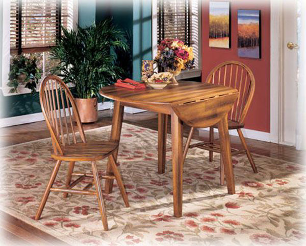 Made with select veneers and hardwood solids. Rustic hand applied finish. Round dining table (-15) features two drop leaves. RTA side chair features microfiber upholstery. Antique finished hardware.