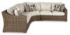 Sporting an easy-on-the-eyes look inspired by driftwood, this 3-piece sectional elevates the art of alfresco living. Beautiful and durable enough for indoor and outdoor use, the high-style/low-maintenance sectional entices with plush, removable cushions wrapped in Nuvella® fabric that’s a breeze to keep clean. Includes 3 pieces: curved corner chair with cushion and left-arm/right-arm facing loveseat. "Left-arm" and "right-arm" describe the position of the arm when you face the piece. All-weather resin wicker handwoven over powder coated rust-proof aluminum frames. 6 throw pillows included. Zippered cushions and throw pillows covered in high-performing Nuvella® fabric. All-weather foam cushion core wrapped in soft polyester. Clean fabric with mild soap and water, let air dry; for stubborn stains, use a solution of 1 cup bleach to 1 gallon water. Imported fabric and fill. Assembly required. Estimated Assembly Time: 50 Minutes.