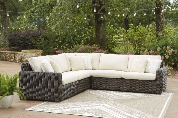 Add luxury, comfort and durability to alfresco fun. This outdoor sectional captures the textural beauty of wicker while withstanding the elements, from rain to shine. With a UV-resistant design, the wonderfully low-maintenance Nuvella+™ fabric maintains its good looks over time. Deep, roomy seating completes the piece, offering ample space to sprawl out. Includes 3 pieces with cushions: outdoor left-arm facing loveseat, corner chair and right-arm facing loveseat. "Left-arm" and "right-arm" describe the position of the arm when you face the piece. All-weather resin wicker handwoven over rust-resistant aluminum frame with durable powder coated finish. Powder coated aluminum resists rusting and fading. All-weather foam cushion core wrapped in soft polyester. Zippered cushions and throw pillows covered in solution-dyed high-performance fabric. Nuvella+ is an outdoor fabric that can be cleaned and offers UV resistance. Clean fabric with mild soap and water, let air dry; for stubborn stains, use a solution of 4 oz. bleach to 28 oz. water. Stainless steel hardware. Designed to withstand the harsh elements of the outdoors. 4 throw pillows with Nuvella fabric included. Estimated Assembly Time: 20 Minutes.