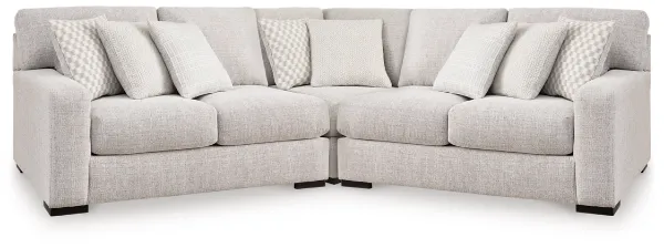 Includes 3 pieces: left-arm facing loveseat, wedge and right-arm facing loveseat. "Left-arm" and "right-arm" describe the position of the arm when you face the piece. Corner-blocked frame. Reversible seat and back cushions. High-resiliency foam cushions wrapped in poly fiber. Accent pillows included; pillows with soft polyfill. Polyester upholsteryNext-Gen Nuvella™ is a family-friendly fabric that is soft, easy to clean, stain-resistant and durable. Easy-to-remove zippered covers for machine washing. Clean fabric with mild soap and water, let air dry; for stubborn stains, use a solution of 4 oz. bleach to 28 oz. water. Exposed feet with faux wood finish . Platform foundation system resists sagging 3x better than spring system after 20,000 testing cycles by providing more even support. Smooth platform foundation maintains tight, wrinkle-free look without dips or sags that can occur over time with sinuous spring foundations. Estimated Assembly Time: 10 Minutes.