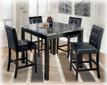 Includes square counter height table and 4 counter height bar stools, Made of wood and veneers, Faux marble tabletop laminated for added protection, Bar stools upholstered in vinyl, Firm, yet comfortable cushioned seat and back, Assembly required