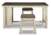 Unique two-tone finish with a combination of Oak and Acacia substrates combining a trendy textured antique white color with table and server tops finished in a textural weathered oak finish. Rectangular dining table features six convenient drawers for storing smaller items. The -02 upholstered host chair inspired by the trendy deconstructed styles for casual living. The -01 side chairs feature a boxed cushion seat. All chairs feature a heavy woven fabric for added textural qualities. The large capacity server has three doors with lattice design. The tall bunching unit has two drawers, three shelves and open lattice sides. D647-32 rectangular counter table features four convenient drawers for storing smaller items. All chairs feature a heavy woven fabric for added textural qualities. D647-13 round drop leaf counter table converts to smaller square version and has a shelf for storage. The D647-42 table will seat four guests with storage cabinet on one end. Storage cabinet has a drawer located at the bottom with a single adjustable shelf located behind two doors above. D647-09 is made with solid wood, veneer and engineered wood substrate in antique white. Heavy woven polyester fabric with nail head trim.