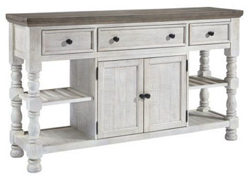 Made with pine solids and veneers with engineered wood. Two tone finish scheme with distressed weathered gray tops combined with a distressed vintage white finish. The large farmhouse style dining table is the highlight of this collection. It features large scaled turned leg posts and thick planked top. Bent slat back chairs and stools feature a soft cushioned seat covered with a thick woven polyester fabric in an oatmeal color. Large scale sideboard with chunky posts, thick mouldings and reversible wine rack/shelves. Fully finished drawer boxes with ball bearing side glides and dovetail construction. Metal knobs with an aged iron color finish. D814-50T/B round dining table features a large scaled turned post and thick planked wood top. D814-50B is made with cast resin components.