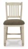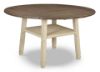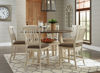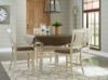 Unique two-tone finish with a combination of Oak and Acacia substrates combining a trendy textured antique white color with table and server tops finished in a textural weathered oak finish. Rectangular dining table features six convenient drawers for storing smaller items. The -02 upholstered host chair inspired by the trendy deconstructed styles for casual living. The -01 side chairs feature a boxed cushion seat. All chairs feature a heavy woven fabric for added textural qualities. The large capacity server has three doors with lattice design. The tall bunching unit has two drawers, three shelves and open lattice sides. D647-32 rectangular counter table features four convenient drawers for storing smaller items. All chairs feature a heavy woven fabric for added textural qualities. D647-13 round drop leaf counter table converts to smaller square version and has a shelf for storage. The D647-42 table will seat four guests with storage cabinet on one end. Storage cabinet has a drawer located at the bottom with a single adjustable shelf located behind two doors above. D647-09 is made with solid wood, veneer and engineered wood substrate in antique white. Heavy woven polyester fabric with nail head trim.