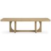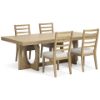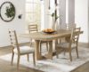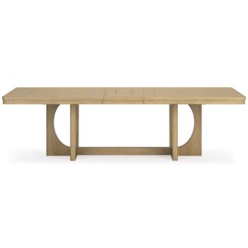 This dining extension table's classic yet contemporary good looks are hard to deny. Its geometric double pedestal base is effortlessly eye-catching, while a metal inlay on the tabletop offers a subtly striking touch. The Rencott dining side chair's classic yet contemporary good looks are hard to deny. Crafted with a modern ladderback design and a softly cushioned seat, it adds a comfortably cozy dimension to everyday seating or when guests gather. With a light oak finish and wire-brushed wood grain texture, this table lends an organic appeal to your delicious dining space ... or wherever family and guests gather.