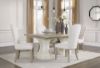 This dining extension table top and base are made with hardwood solids, oak veneer and MDF substrate. Paired with striking dining side chair looks equally at home in traditional or modern settings. A rich layered gray finish enhances the wood grain colors for a modern look. Light textured fabric covers the elegantly shaped chair back. It's a delicious traditional touch in a dining room or anywhere you want to show off your good taste.