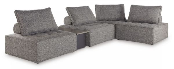 This sectional seeks to bring serenity to your outdoor seating area. Channeling Japandi and casual contemporary aesthetics, its low profile encourages laid-back living without sacrificing sophistication. The included back cushions complete moments of tranquility with superior comfort, while the seamlessly incorporated end table provides an ideal spot to rest a poolside read. And with the modular design of each piece, you can effortlessly rearrange the sectional to suit your needs. Includes 5 modular pieces: 4 outdoor lounge chairs and 1 outdoor end table. Chair frame and table made with aluminum. Solution-dyed high-performance fabric. Nuvella® is an outdoor fabric that can be cleaned and offers UV resistance. Stainless steel hardware. Designed to withstand the harsh elements of the outdoors. Cushioned seat. Back cushion included Includes PVC protective weather cover. Clean fabric with mild soap and water, let air dry; for stubborn stains, use a solution of 1 cup bleach to 1 gallon water. Assembly required. Estimated Assembly Time: 80 Minutes.