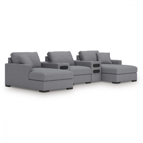 This sectional with audio system and chaise evolves as your family’s needs do. Its adaptable modular design makes staging and rearranging a breeze. Living room messes leaving you stressed? Cleaning is that much easier with stain-resistant and durable Next-Gen Nuvella™ fabric. Storage consoles with built-in audio systems give family movie nights or gaming with friends an immersive upgrade. Complete with USB charging, this sectional brings fashionable function to everyday lounging. Includes 5 modular pieces: left-arm facing corner chaise, armless chair, 2 audio consoles with storage and right-arm facing corner chaise "Left-arm" and "right-arm" describe the position of the arm when you face the piece Modular pieces can float anywhere; sides are finished (with no connectors) Corner-blocked frame; reversible back and seat cushions; high-resiliency foam cushions wrapped in poly fiber Throw pillows included; pillows with soft polyfill Polyester upholstery; Next-Gen Nuvella™ is a family-friendly fabric that is soft, easy to clean, stain-resistant and durable Easy-to-remove zippered covers for machine washing Clean fabric with mild soap and water, let air dry; for stubborn stains, use a solution of 4 oz. bleach to 28 oz. water Low-profile accent legs with faux wood finish Console with removable plexiglass top; pull-out drawer for storage; built-in audio sound system with wireless connectivity; audio controls located on console; USB charging Power cord included; UL Listed Platform foundation system resists sagging 3x better than spring system after 20,000 testing cycles by providing more even support Smooth platform foundation maintains tight, wrinkle-free look without dips or sags that can occur over time with sinuous spring foundations Estimated Assembly Time: 15 Minutes