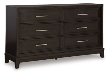 This dresser combines modern and art deco styles for both traditional and contemporary arrangements. With elegant stepped moulded framing and ample storage, it adds dimension to your sanctuary while keeping your belongings organized and clutter-free. Indulge in a fresh look that feels right at home. Made with hardwood solids, engineered wood and MDF substrates. Grayish brown wood-tone finish. Metal bar pulls with satin nickel-tone finish. 6 smooth-gliding drawers with dovetail construction and heavy duty ball-bearing side glides (top drawers felt lined). Estimated Assembly Time: 15 Minutes.
