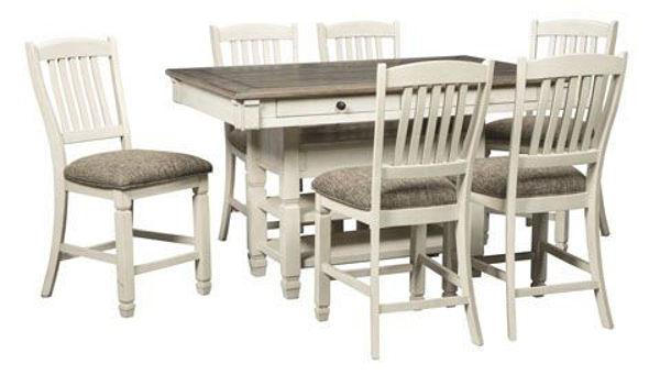 Unique two-tone finish with a combination of Oak and Acacia substrates combining a trendy textured antique white color with table and server tops finished in a textural weathered oak finish. Rectangular dining table features six convenient drawers for storing smaller items. The -02 upholstered host chair inspired by the trendy deconstructed styles for casual living. The -01 side chairs feature a boxed cushion seat. All chairs feature a heavy woven fabric for added textural qualities. The large capacity server has three doors with lattice design. The tall bunching unit has two drawers, three shelves and open lattice sides. D647-32 rectangular counter table features four convenient drawers for storing smaller items. All chairs feature a heavy woven fabric for added textural qualities. D647-13 round drop leaf counter table converts to smaller square version and has a shelf for storage. The D647-42 table will seat four guests with storage cabinet on one end. Storage cabinet has a drawer located at the bottom with a single adjustable shelf located behind two doors above. D647-09 is made with solid wood, veneer and engineered wood substrate in antique white. Heavy woven polyester fabric with nail head trim.