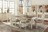 Unique two-tone finish with a combination of Oak and Acacia substrates combining a trendy textured antique white color with table and server tops finished in a textural weathered oak finish. Rectangular dining table features six convenient drawers for storing smaller items. The -02 upholstered host chair inspired by the trendy deconstructed styles for casual living. The -01 side chairs feature a boxed cushion seat. All chairs feature a heavy woven fabric for added textural qualities. The large capacity server has three doors with lattice design. The tall bunching unit has two drawers, three shelves and open lattice sides. D647-32 rectangular counter table features four convenient drawers for storing smaller items. All chairs feature a heavy woven fabric for added textural qualities. D647-13 round drop leaf counter table converts to smaller square version and has a shelf for storage. The D647-42 table will seat four guests with storage cabinet on one end. Storage cabinet has a drawer located at the bottom with a single adjustable shelf located behind two doors above. D647-09 is made with solid wood, veneer and engineered wood substrate in antique white. Heavy woven polyester fabric with nail head trim.