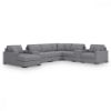 This sectional with chaise evolves as your family’s needs do. Its adaptable modular design makes staging and rearranging a breeze. Living room messes leaving you stressed? Cleaning is that much easier with stain-resistant and durable Next-Gen Nuvella™ fabric. Handy consoles with subtle storage keep all your remotes corralled. From easygoing mornings to family movie nights, this sectional brings fashionable function to everyday lounging. Includes 8 modular pieces: left-arm facing corner chaise, 2 consoles with storage, 3 armless chairs, wedge and right-arm facing corner chair "Left-arm" and "right-arm" describe the position of the arm when you face the piece Modular pieces can float anywhere; sides are finished (with no connectors) Corner-blocked frame Reversible back and seat cushions; high-resiliency foam cushions wrapped in poly fiber Throw pillows included; pillows with soft polyfill Polyester upholstery; Next-Gen Nuvella™ is a family-friendly fabric that is soft, easy to clean, stain-resistant and durable Easy-to-remove zippered covers for machine washing Clean fabric with mild soap and water, let air dry; for stubborn stains, use a solution of 4 oz. bleach to 28 oz. water Low-profile accent legs with faux wood finish Console with removable plexiglass top; pull-out drawer for storage Platform foundation system resists sagging 3x better than spring system after 20,000 testing cycles by providing more even support Smooth platform foundation maintains tight, wrinkle-free look without dips or sags that can occur over time with sinuous spring foundations Estimated Assembly Time: 20 Minutes