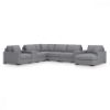 This sectional with chaise evolves as your family’s needs do. Its adaptable modular design makes staging and rearranging a breeze. Living room messes leaving you stressed? Cleaning is that much easier with stain-resistant and durable Next-Gen Nuvella™ fabric. Handy consoles with subtle storage keep all your remotes corralled. From easygoing mornings to family movie nights, this sectional brings fashionable function to everyday lounging. Includes 8 modular pieces: left-arm facing corner chair, 2 consoles with storage, 3 armless chairs, wedge and right-arm facing corner chaise "Left-arm" and "right-arm" describe the position of the arm when you face the piece Modular pieces can float anywhere; sides are finished (with no connectors) Corner-blocked frame Reversible back and seat cushions; high-resiliency foam cushions wrapped in poly fiber Throw pillows included; pillows with soft polyfill Polyester upholstery; Next-Gen Nuvella™ is a family-friendly fabric that is soft, easy to clean, stain-resistant and durable Easy-to-remove zippered covers for machine washing Clean fabric with mild soap and water, let air dry; for stubborn stains, use a solution of 4 oz. bleach to 28 oz. water Low-profile accent legs with faux wood finish Console with removable plexiglass top; pull-out drawer for storage Platform foundation system resists sagging 3x better than spring system after 20,000 testing cycles by providing more even support Smooth platform foundation maintains tight, wrinkle-free look without dips or sags that can occur over time with sinuous spring foundations Estimated Assembly Time: 20 Minutes