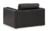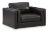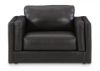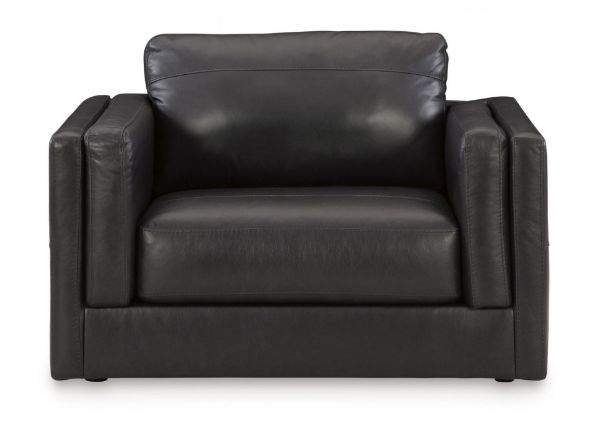 Keen on crisp, contemporary design? Adore the pleasure of leather? Look no further. This oversized chair satisfies on every level. Richly textured and decadently supple, the plush cushions are wrapped with expertly matched leather and faux leather upholstery in an on-trend onyx tone. Sleek double-padded arms and a low, clean-lined profile complete the chair's simply chic appeal. Corner-blocked frame Attached cushions High-resiliency foam cushions wrapped in poly fiber Genuine leather covers inside areas such as the back, seat and arm cushions; skillfully matched faux leather covers the remaining areas Lightly waxed pullup look; lightly buffed and embossed with protective finish to prevent scratches Due to its natural origin, real leather can show individual characteristics such as healed scars, growth marks, grain variation and shade variation Natural variations make each hide unique and do not detract from the wearing qualities of leather Platform foundation system resists sagging 3x better than spring system after 20,000 testing cycles by providing more even support Smooth platform foundation maintains tight, wrinkle-free look without dips or sags that can occur over time with sinuous spring foundations Non-skid legs