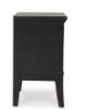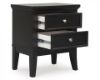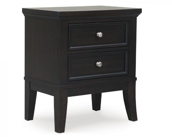 This nightstand features a simple design that effortlessly coordinates with different interiors. Its clean lines and rich dark brown finish create a classic, contemporary look, while smooth-gliding drawers handle bedside storage. Let the blend of sophistication and easy style transform your dreams into reality. Made of hardwood solids, veneers and MDF substrates Dark brown finish Knobs with satin nickel-tone finish 2 drawers with fully finished interior, dovetail construction and heavy duty ball-bearing side glides (top drawer felt lined) Flare legs Estimated Assembly Time: 15 Minutes