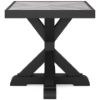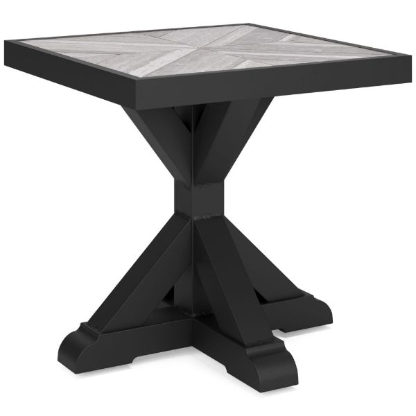 Sporting an easy-on-the-eyes elegance, this end table elevates the art of alfresco living. Beautiful and durable enough for indoor and outdoor use, this high-style/low-maintenance table charms with X-leg farmhouse styling. With a unique reverse diamond tile pattern, the thick porcelain tabletop provides unparalleled sophistication. All-weather, rust-resistant, powder coated aluminum base. Porcelain tabletop. Stainless steel hardware. Sponge clean with damp cloth. Designed to withstand the harsh elements of the outdoors. No assembly required.