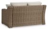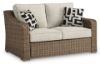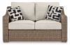 Sporting an easy-on-the-eyes look inspired by driftwood, this loveseat elevates the art of alfresco living. Beautiful and durable enough for indoor and outdoor use, the high-style/low-maintenance seating entices with plush removable cushions wrapped in Nuvella® fabric that’s a breeze to keep clean. All-weather resin wicker handwoven over rust-resistant aluminum frame with durable powder coated finish. Powder coated aluminum resists rusting and fading. All-weather foam cushion core wrapped in soft polyester. Zippered cushions and throw pillows covered in solution-dyed high-performance fabric. Nuvella is an outdoor fabric that can be cleaned and offers UV resistance. Clean fabric with mild soap and water, let air dry; for stubborn stains, use a solution of 4 oz. bleach to 28 oz. water. 2 throw pillows included. Stainless steel hardware. Designed to withstand the harsh elements of the outdoors. Assembly required. Estimated Assembly Time: 30 Minutes.