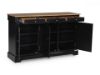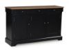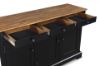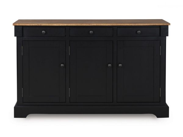 Raise the bar on modern farmhouse style with this dining buffet. Its handsome good looks are accentuated with a two-tone finish and a casual butcher block veneer top. The sturdy silhouette adds a hearty element, whether your style is vintage, country or eclectic. Three drawers and three cabinets with adjustable shelves serve your entertaining needs well. Made with hardwood solids, mango wood veneer and MDF substrate Top with butcher block veneer pattern in deep brown wood tone finish Base with warm satin black finish Hardware with dark bronze-tone finish 3 smooth-gliding drawers with felt lining and heavy-duty ball-bearing side glides 3 cabinets, each with 2 adjustable shelves