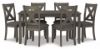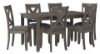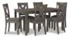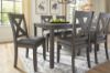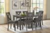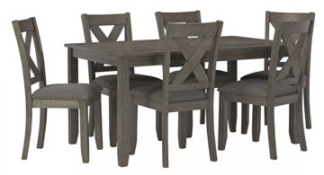 Casual lifestyle design constructed with Acacia veneer and solids. Finished in an antiqued gray wash color. X-back chairs feature solid wood frame and cushioned seat covered with a gray textured polyester fabric with nail head trim. Matching backless bench features nail head trim. D388-113 has storage shelves on one end with a sturdy stretcher. Backless stools with upholstered saddle seat design. D388-223 counter height table and three bar stools. Single smooth gliding drawer. Includes 2 USB ports and AC power outlet; UL listed. D388-223 stool dimensions: 16"W x 14"W x 25"H. D388-425 rectangular dining table and six X-back chairs. Chairs feature solid wood frame and cushioned seat covered with a gray textured polyester fabric with nail head trim. D388-425 chair dimensions: 19"W x 22"W x 38"H. D388-224/230 has solid hardwood frames with metal back supports and footrest. Swivel seats feature a gray textured polyester fabric with nail head trim. Finished in an antiqued gray wash color.