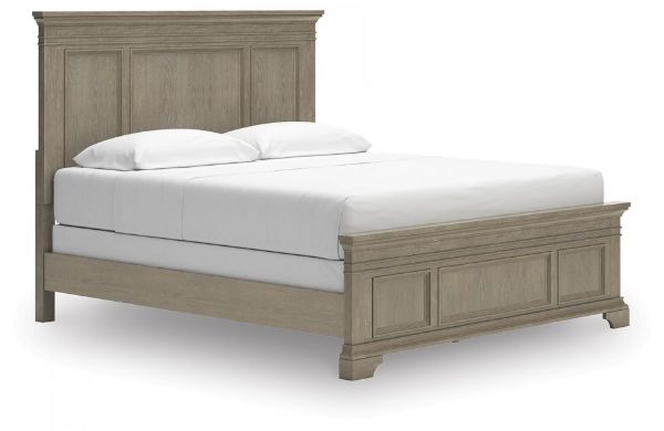 Indulge in relaxed refinement with this California king panel bed. Its art deco-inspired moulding, picture frame panels and casual grayish brown finish exemplify an updated take on traditional styling. Inspired by the past, reimagined for the present. Now there’s a bed with staying power. Includes panel headboard, rails, and footboard with slats Made with pine solids, oak veneer and MDF substrates Light grayish brown finish with white wax wood grain texture Foundation/box spring required, sold separately Mattress available, sold separately Assembly required Estimated Assembly Time: 40 Minutes