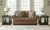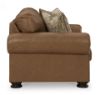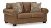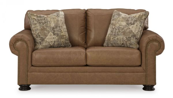 Merging traditional motifs with a modern hue, this loveseat ties your transitional seating area together. Classic roll arms decorated with nailhead trim bookend the comfortable cushions for a bit of extra flair. It’s approachable, yet luxurious. With this well-dressed loveseat, everyday relaxation gets a distinctive upgrade. Corner-blocked frame Attached back and loose seat cushions High-resiliency foam cushions wrapped in poly fiber Accent pillows included Pillows with feather-fiber blend Genuine leather covers inside areas such as the back, seat and arm cushions; skillfully matched faux leather covers the remaining areas Top-grain leather simulating a wax oil pullup with crackle effect Lightly buffed and embossed with clear protective finish to prevent scratches Due to its natural origin, real leather can show individual characteristics such as healed scars, growth marks, grain variation and shade variation Natural variations make each hide unique and do not detract from the wearing qualities of leather Decorative turn leg Platform foundation system resists sagging 3x better than spring system after 20,000 testing cycles by providing more even support Smooth platform foundation maintains tight, wrinkle-free look without dips or sags that can occur over time with sinuous spring foundations