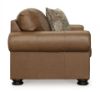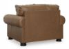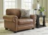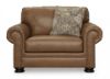 Merging traditional motifs with a modern hue, this oversized chair ties your transitional seating area together. Classic roll arms decorated with nailhead trim bookend the comfortable cushions for a bit of extra flair. It’s approachable, yet luxurious. With this well-dressed chair, everyday relaxation gets a distinctive upgrade. Corner-blocked frame Attached back and loose seat cushions High-resiliency foam cushions wrapped in poly fiber Accent pillows included Pillows with feather-fiber blend Genuine leather covers inside areas such as the back, seat and arm cushions; skillfully matched faux leather covers the remaining areas Top-grain leather simulating a wax oil pullup with crackle effect Lightly buffed and embossed with clear protective finish to prevent scratches Due to its natural origin, real leather can show individual characteristics such as healed scars, growth marks, grain variation and shade variation Natural variations make each hide unique and do not detract from the wearing qualities of leather Decorative turn leg Platform foundation system resists sagging 3x better than spring system after 20,000 testing cycles by providing more even support Smooth platform foundation maintains tight, wrinkle-free look without dips or sags that can occur over time with sinuous spring foundations