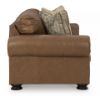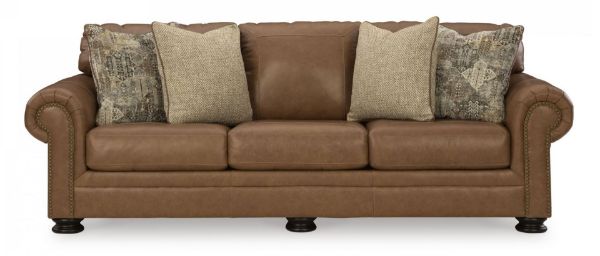 Merging traditional motifs with a modern hue, this sofa ties your transitional seating area together. Classic roll arms decorated with nailhead trim bookend the comfortable cushions for a bit of extra flair. It’s approachable, yet luxurious. With this well-dressed sofa, everyday relaxation gets a distinctive upgrade. Corner-blocked frame Attached back and loose seat cushions High-resiliency foam cushions wrapped in poly fiber Accent pillows included Pillows with feather-fiber blend Genuine leather covers inside areas such as the back, seat and arm cushions; skillfully matched faux leather covers the remaining areas Top-grain leather simulating a wax oil pullup with crackle effect Lightly buffed and embossed with clear protective finish to prevent scratches Due to its natural origin, real leather can show individual characteristics such as healed scars, growth marks, grain variation and shade variation Natural variations make each hide unique and do not detract from the wearing qualities of leather Decorative turn leg Platform foundation system resists sagging 3x better than spring system after 20,000 testing cycles by providing more even support Smooth platform foundation maintains tight, wrinkle-free look without dips or sags that can occur over time with sinuous spring foundations