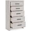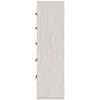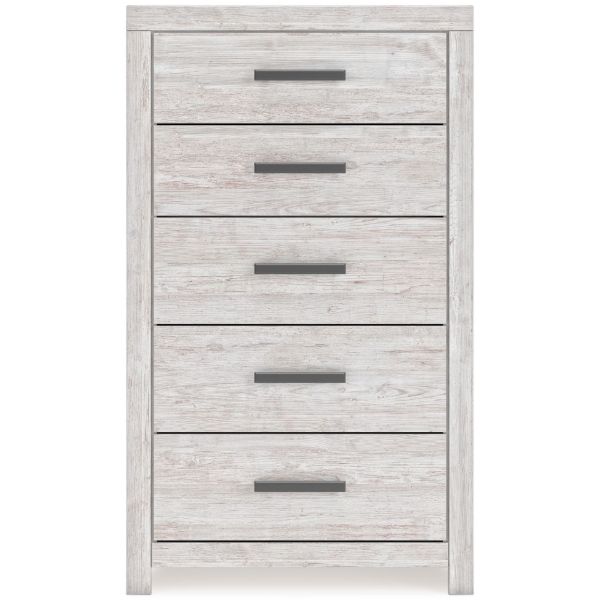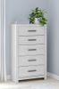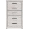 Charmingly designed, this chest of drawers embraces the aesthetics of countryside living and repurposes them for modern settings. Its whitewash paint, replicating the wear and tear of time, appeals to your love of vintage character. A fresh take on function, the smooth-gliding drawers are a chic storage spot for your clothes and linens. Made with engineered wood (MDF/particleboard/plywood) and decorative laminate for the right balance of affordability and durability Whitewash replicated worn through paint with authentic touch Decorative laminate replicates natural or man-made material surfaces with consistent color, pattern and texture Large handles in black finish 5 smooth-gliding drawers Framed front and pilasters Safety is a top priority, clothing storage units are designed to meet the most current standard for stability, ASTM F 2057 (ASTM International) Drawers extend out to accommodate maximum access to drawer interior while maintaining safety Minor assembly required Estimated Assembly Time: 5 Minutes