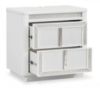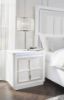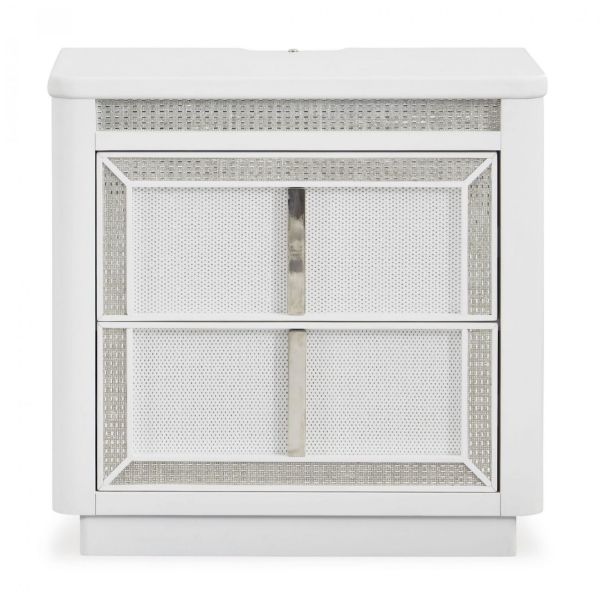 Transform your bedroom with this nightstand. Its modern design and glamorous details create a sophisticated retreat. The built-in LED lighting and rhinestone-framed drawers add style and practical storage, while USB charging keeps you connected. Let your sanctuary shine and never let anyone dull your sparkle. Made with solid wood components, MDF substrate and decorative laminate White lacquer finish Vertical metal drawer pulls Built-in LED lighting with 3-way dimmer switch 2 drawers with fully finished interior, dovetail construction and heavy duty ball-bearing side glides Drawers with rhinestone frames; textured laminate drawer fronts 110V power supply with USB-A and USB-C charging ports Power cord included; UL Listed Estimated Assembly Time: 15 Minutes