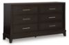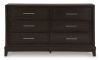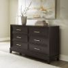 This dresser combines modern and art deco styles for both traditional and contemporary arrangements. With elegant stepped moulded framing and ample storage, it adds dimension to your sanctuary while keeping your belongings organized and clutter-free. Indulge in a fresh look that feels right at home. Made with hardwood solids, engineered wood and MDF substrates. Grayish brown wood-tone finish. Metal bar pulls with satin nickel-tone finish. 6 smooth-gliding drawers with dovetail construction and heavy duty ball-bearing side glides (top drawers felt lined). Estimated Assembly Time: 15 Minutes.