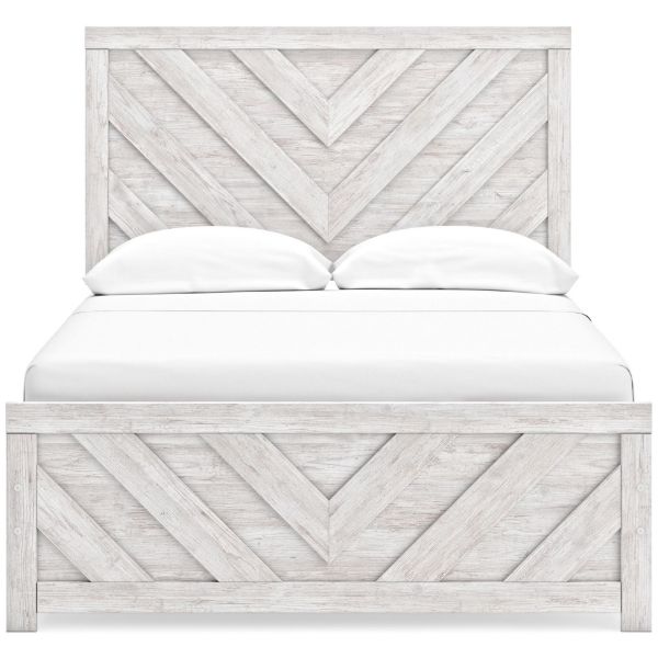 Charmingly designed, this full panel bed embraces the aesthetics of countryside living and repurposes them for modern settings. Its whitewash paint, replicating the wear and tear of time, appeals to your love of vintage character. And a chic chevron pattern on the headboard and footboard keeps your bedroom effortlessly on trend. Includes panel headboard/footboard and rails Made with engineered wood (MDF/particleboard/plywood) and decorative laminate for the right balance of affordability and durability Whitewash replicated worn through paint with authentic touch Decorative laminate replicates natural or man-made material surfaces with consistent color, pattern and texture Foundation/box spring required, sold separately Mattress available, sold separately Minor assembly required Estimated Assembly Time: 25 Minutes