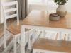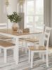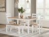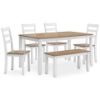 Complement your home’s simply relaxed sensibility with this dining table, chairs and bench. A crisp white hue offers a chic contrast to the natural wood tone, for a neutral look that vibes with a variety of aesthetics. Whether you're sipping your morning coffee, settling in for dinner or working from home, this set is smartly designed for everyday comfort and style. Includes dining table, bench and 4 chairs Table made with rubberwood solids, mango wood veneer and MDF substrate Chairs made with solid wood frames Light natural mango wood finish with a clean white Table with butcher block veneer top Chairs and bench with mango wood veneer seats Contoured chair seats Chairs include adjustable levelers Assembly required Estimated Assembly Time: 45 Minutes