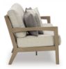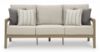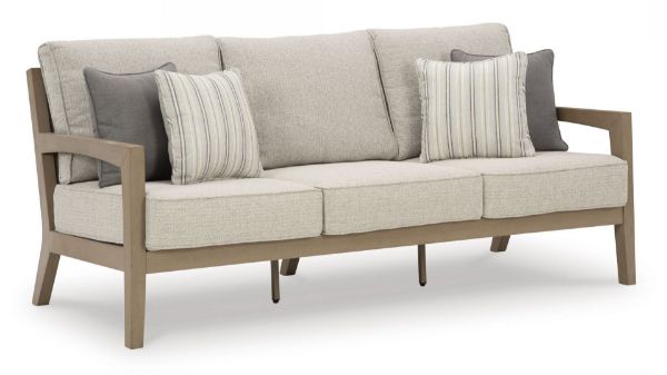 This sofa is a beautiful addition to any outdoor living space. Effortless in its simplicity, this piece echoes your easygoing sensibilities. Combining durable, cutting-edge engineered materials, its Weatherwood construction enhances the contemporary design. Rest assured, the thick cushions and accent pillows are wrapped in high-performance fabric that’s fade-resistant, stain-resistant and a breeze to clean. Pair with the matching loveseat and swivel lounge chair for a spectacular seating arrangement. Weatherwood, an engineered resin polymer, is designed to offer a long-lasting alternative to wood. Heavyweight material is colored throughout, UV resistant and ideal for high-wind areas. Can be cleaned with mild soap and water. Stainless steel hardware. Solution-dyed high-performance fabric. Nuvella+™ is an outdoor fabric that can be cleaned and offers enhanced UV resistance. Clean fabric with mild soap and water, let air dry; for stubborn stains, use a solution of 4 oz. bleach to 28 oz. water. All-weather foam cushion core wrapped in soft polyester. Accent pillows included. Imported fabric and fill. Arrives assembled. Estimated Assembly Time: 15 Minutes.