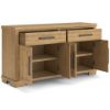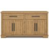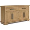 This dining server is a favorite for casual rustic interiors. Offering plenty of storage, it’s your answer for everyday living and impromptu entertaining. And the cabinets with adjustable shelves? Deliciously versatile and functional. Made with rubberwood solids, distressed pine veneers and MDF substrates Distressed light brown pine finish Metal bar pulls with black finish Top surface with distressed planked effect 4-door cabinet with 2 adjustable wood shelves 2 drawers with black felt bottoms, fully finished interiors and ball-bearing side glides Estimated Assembly Time: 15 Minutes