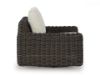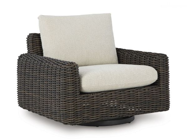 Add luxury, comfort and durability to alfresco fun. This outdoor swivel glider lounge chair captures the textural beauty of wicker while withstanding the elements, from rain to shine. With a UV-resistant design, the wonderfully low-maintenance Nuvella+™ fabric maintains its good looks over time. Deep, roomy seating completes the piece, offering ample space to sprawl out. All-weather resin wicker handwoven over rust-resistant aluminum frame with durable powder coated finish. Powder coated aluminum resists rusting and fading. All-weather foam cushion core wrapped in soft polyester. Zippered cushions and throw pillows covered in solution-dyed high-performance fabric. Nuvella+ is an outdoor fabric that can be cleaned and offers UV resistance. Clean fabric with mild soap and water, let air dry; for stubborn stains, use a solution of 4 oz. bleach to 28 oz. water. Stainless steel hardware. Designed to withstand the harsh elements of the outdoors. 360-degree swivel. Estimated Assembly Time: 15 Minutes.
