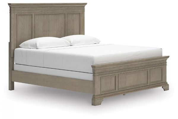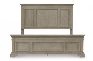 Indulge in relaxed refinement with this king panel bed. Its art deco-inspired moulding, picture frame panels and casual grayish brown finish exemplify an updated take on traditional styling. Inspired by the past, reimagined for the present. Now there’s a bed with staying power. Includes panel headboard, rails, and footboard with slats Made with pine solids, oak veneer and MDF substrates Light grayish brown finish with white wax wood grain texture Foundation/box spring required, sold separately Mattress available, sold separately Assembly required Estimated Assembly Time: 40 Minutes