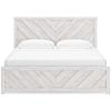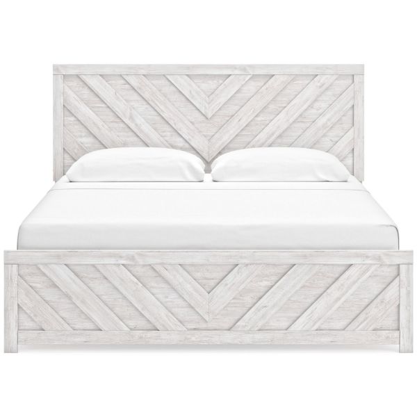 Charmingly designed, this king panel bed embraces the aesthetics of countryside living and repurposes them for modern settings. Its whitewash paint, replicating the wear and tear of time, appeals to your love of vintage character. And a chic chevron pattern on the headboard and footboard keeps your bedroom effortlessly on trend. Includes panel headboard/footboard and rails Made with engineered wood (MDF/particleboard/plywood) and decorative laminate for the right balance of affordability and durability Whitewash replicated worn through paint with authentic touch Decorative laminate replicates natural or man-made material surfaces with consistent color, pattern and texture Foundation/box spring required, sold separately Mattress available, sold separately Minor assembly required Estimated Assembly Time: 25 Minutes