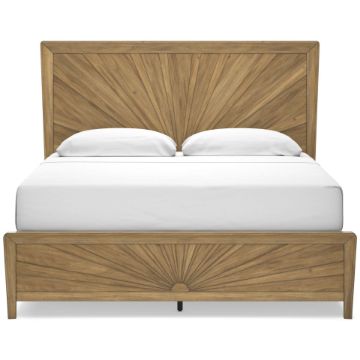 To you, simplicity is the ultimate form of sophistication. With this king panel bed, you invest in making everyday life simply beautiful. Emphasizing the stunning look of natural materials, its statement-making sunburst paneling has a bold, welcoming character. A forward-thinking take on contemporary design, this bed balances quiet elegance with a fresh boho feel. Includes panel headboard/footboard, slats and rails Made with hardwood solids, acacia veneer and MDF substrates Finished in a light glazed brown wood tone that enhances the natural beauty of the acacia veneer Headboard and footboard with sunburst array of raised overlay veneer panels Foundation/box spring required, sold separately Mattress available, sold separately Assembly required Estimated Assembly Time: 20 Minutes