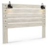 What a delightful take on rustic industrial style. Whether modern loft or modern farmhouse, this king panel headboard makes itself at home. The wispy whitewash palette enhances without covering the grain for that weathered look you crave. Love to read in bed? You’re sure to find the retro-chic light sconces and USB plug-ins on the open-slat style headboard such a bright idea. Made of engineered wood (MDF/particleboard) and decorative laminate Wispy white finish over replicated oak grain with authentic touch 2 decorative sconce lights, LED with 3 AA batteries 2 slim-profile USB charging stations Power cord included; UL Listed Hardware not included ¼" bolts are needed to attach headboard to existing bed frame Bolt length depends on thickness of your bed frame Assembly required Estimated Assembly Time: 10 Minutes