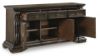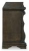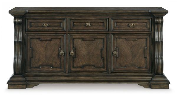 From its ornamental appliques to its large scale, this dining buffet makes a bold statement. With multiple cabinets and drawers to store necessities, the opulent piece wows with stunning style. The look is timeless. The feel? Right at home. Made with hardwood solids, oak and ash swirl veneers, MDF substrates and cast resin components Dark brown finish 3 cabinets, each with single adjustable shelf 3 smooth-gliding drawers with felt lining Assembly required Estimated Assembly Time: 15 Minutes