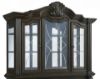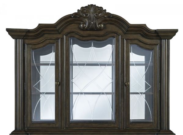From its ornamental appliques to its large scale, this dining hutch makes a bold statement. With beveled glass windows, LED lighting and a mirrored interior, the opulent piece wows with stunning style. The look is timeless. The feel? Right at home. Made with hardwood solids, oak and ash swirl veneers with MDF substrates and cast resin components Dark brown finish Cabinet doors with beveled glass windows Mirrored glass interior 2 clear glass shelves LED display lighting Assembly required Estimated Assembly Time: 15 Minutes