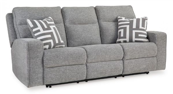 If style is the question, then this power reclining sofa is the answer. Its clean-lined profile is beautifully contemporary. High-performance fabric, machine-washable pillows and plump cushioning make it so easy to comfortably kick up your heels The adjustable Easy View™ headrest allows a primo view of the TV, and the extended ottoman provides extra room to really stretch out. Simply sit back, chill out and recline away—this sofa is designed to be your favorite seat in the house.