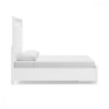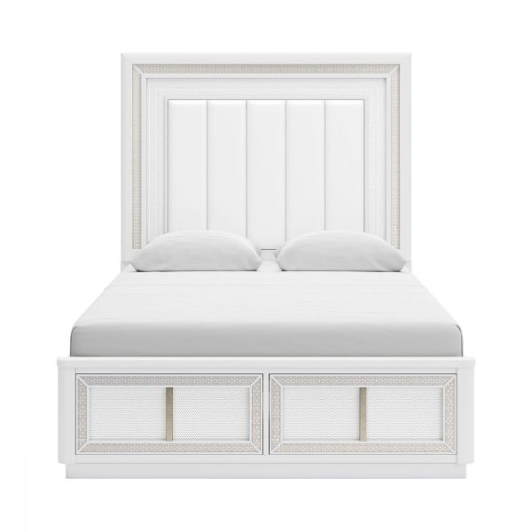 Transform your bedroom with this upholstered storage bed. Its LED lighting, rhinestone framing and faux leather panels exude modern glamour. And the convenient storage footboard offers a practical solution for organizing and accessing belongings. Let your sanctuary shine—and never let anyone dull your sparkle. Includes queen upholstered headboard, storage footboard, rails and roll slats Made with solid wood components, MDF substrate and decorative laminate White lacquer finish Vertical metal drawer pulls Faux leather upholstery Built-in LED lighting with 3-way dimmer switch 2 drawers with fully finished interior, dovetail construction and ball-bearing side glides Drawers with rhinestone frames; textured laminate drawer fronts Power cord included; UL Listed Bed does not require additional foundation/box spring; accommodates most zero clearance adjustable bases with the addition of a bunkie board Mattress available, sold separately Assembly required Estimated Assembly Time: 40 Minutes