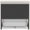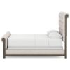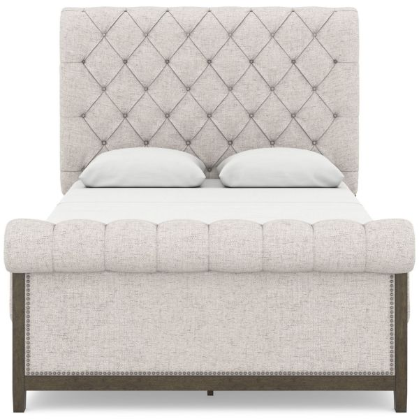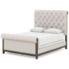 With its rich dark brown wood finish, this queen upholstered bed gives modern farmhouse styling a substantial sensibility. Exaggerated rolled tops on the headboard and footboard are elevated with beautiful tufting and nailhead trim. Subtle touches elevate this bed into a statement piece that’s timeless, functional and versatile. Includes headboard, footboard and rails Made with rubberwood solids, mango wood veneer and MDF substrate Frame with rich dark brown wood finish Neutral polyester upholstery Button tufting Nailhead trim Foundation/box spring required, sold separately Mattress available, sold separately Assembly required Bed is compatible with an adjustable base Estimated Assembly Time: 35 Minutes