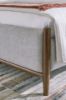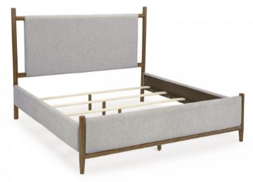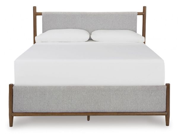 Embrace the allure and charm of your contemporary or mid-century interiors with this queen upholstered panel bed. Its versatile, timeless design, featuring a sling-style cushioned headboard, gently cradles your senses. Ready to refresh and redefine your space, this bed is the ideal choice to elevate your bedroom retreat. Includes upholstered panel headboard and footboard Solid wood frame Due to the use of natural wood materials, some variations may occur Frame with medium brown wood tone finish Polyester upholstery Tapered legs Foundation/box spring required, sold separately Mattress available, sold separately Assembly required Estimated Assembly Time: 20 Minutes