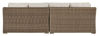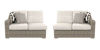 Includes left-arm facing loveseat, right-arm facing loveseat and 4 throw pillows "Left-arm" and "right-arm" describe the position of the arm when you face the piece For indoor or outdoor use All-weather resin wicker handwoven over powder coated rust-proof aluminum frames Cushions and pillows covered in high-performing Nuvellaâ„¢ fabric All-weather foam cushion core wrapped in soft polyester Clean fabric with mild soap and water, let air dry; for stubborn stains, use a solution of 1 cup bleach to 1 gallon water Imported fabric and fill Assembly required