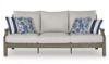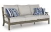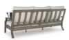 Experience the perfect combination of durability and style with this outdoor sofa. Enhanced by sumptuously soft yet durable cushions wrapped in high-performing, low-maintenance Nuvella+™ fabric, it's designed to provide you with years of enjoyment. This delightful addition to your outdoor space creates an oasis where comfort and beauty thrive. Rust-resistant aluminum frame with durable powder coated finish. Powder coated aluminum resists rusting and fading. Wood-look finish. Loose back and seat cushions. All-weather foam cushion core wrapped in soft polyester. Zippered cushions and throw pillows covered in solution-dyed high-performance fabric. Nuvella+ is an outdoor fabric that can be cleaned and offers enhanced UV resistance. Clean fabric with mild soap and water, let air dry; for stubborn stains, use a solution of 4 oz. bleach to 28 oz. water. 4 Nuvella throw pillows included. Stainless steel hardware. Designed to withstand the harsh elements of the outdoors. Assembly required. Estimated Assembly Time: 30 Minutes.