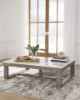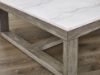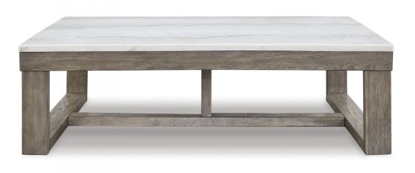 This coffee table is simple in design but big on style. Finished with a trend-right grayish brown wood tone, its bold, blocky profile and natural marble top are timeless classic choices that work so well with large sectional family room settings. Adding to its beauty, the marble top's color variations, fissures, mineral deposits and veining are naturally formed and are not defects. Made with oak veneer and MDF substrate Grayish brown wood-tone finish Natural marble top Color variations, fissures, mineral deposits and veining in the marble top are naturally formed characteristics Assembly required Estimated Assembly Time: 30 Minutes
