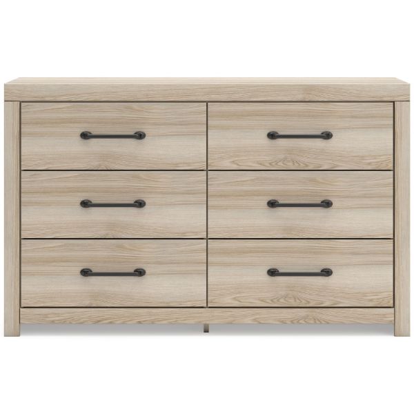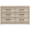 When merged in just the right way, rustic and industrial styles can make one happy marriage. Case in point: this dresser. It offers a refined take on barn board beauty, with subtle replicated wood grain showcasing a natural finish for a sense of authenticity. Elongated drawer pulls elevate the aesthetic. Made with engineered wood (MDF/particleboard/plywood) and decorative laminate for the right balance of affordability and durability Natural finish with replicated wood grain Decorative laminate replicates natural or man-made material surfaces with consistent color, pattern and texture 6 smooth-gliding drawers Drawer interiors are lined with a faux linen laminate for a clean, finished look Large-scale hardware with dark finish Safety is a top priority, clothing storage units are designed to meet the most current standard for stability, ASTM F 2057 (ASTM International) Drawers extend out to accommodate maximum access to drawer interior while maintaining safety Minor assembly required
