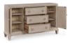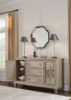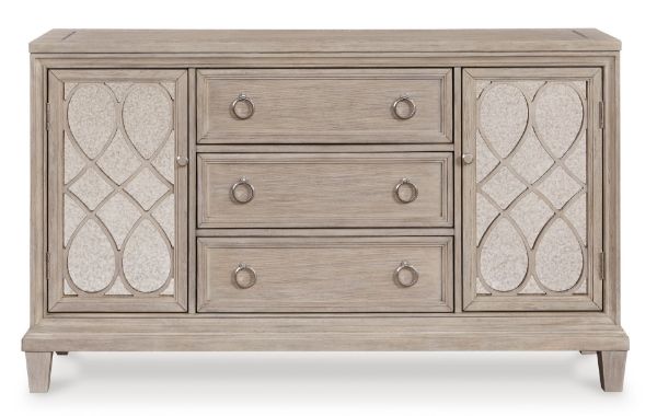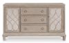 This striking dining server is equally at home in traditional or modern settings. A rich layered gray finish enhances the wood grain colors for a modern look. Two delicious doors and spacious drawers for essentials feature picture frame moulding for a clean yet sophisticated design. Decorative fretwork and antiqued mirror door panels make for a tastefully traditional touch in a dining room or entryway.